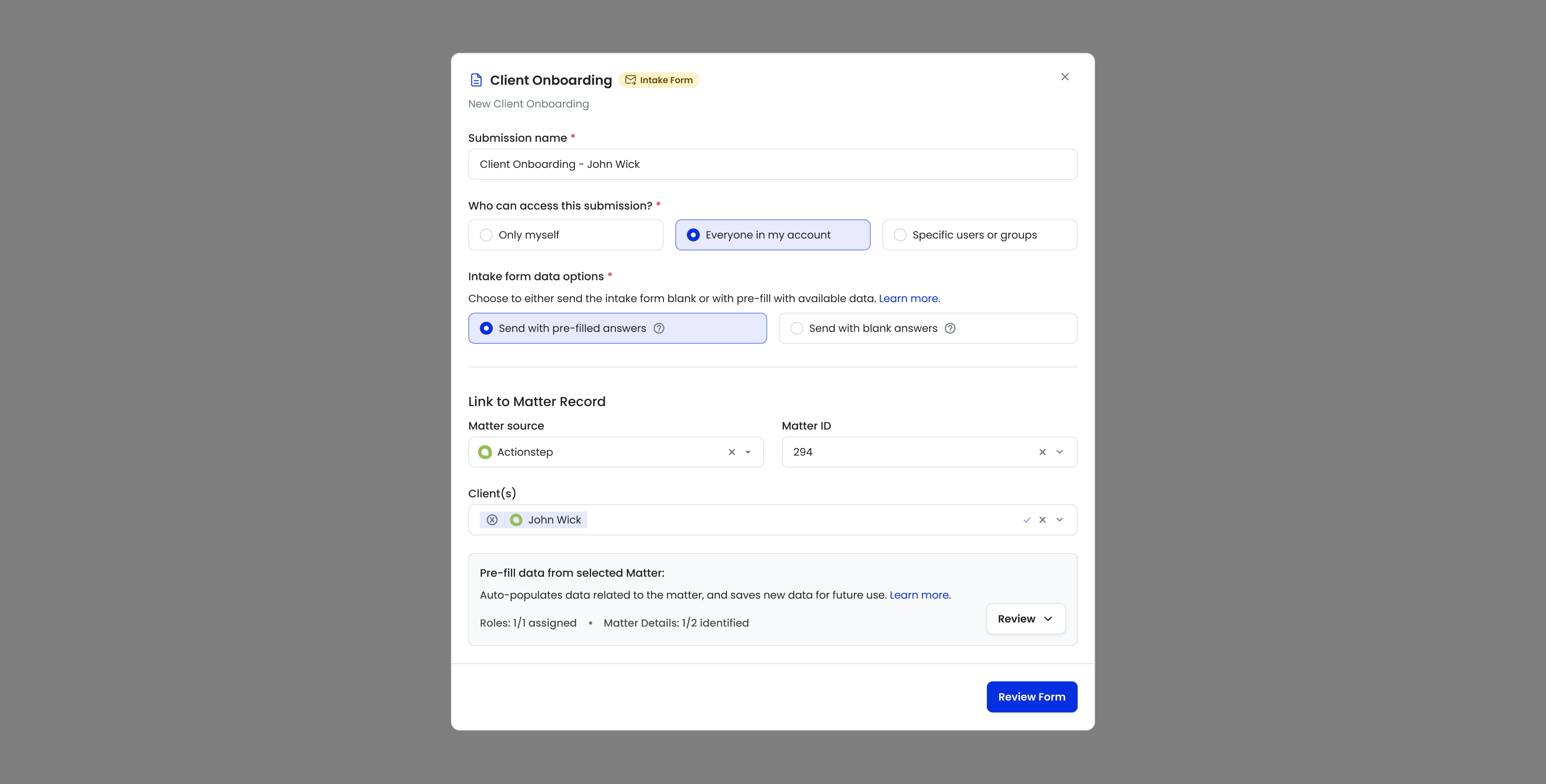 The creation process is largely the same as it is today. The key difference for a form filler is to select the respective matter when sending an intake form.