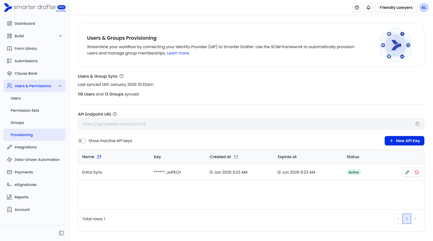 The integration is designed to be lightweight and easy to deploy. Firms generate a simple API key within Smarter Drafter for use with Entra, then follow the steps in Entra to complete mapping and syncing of data.